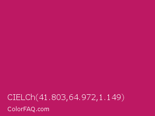 CIELCh 41.803,64.972,1.149 Color is a normal rose color and the nearest color is Rose Red #c21e56. Hex code #bd1863 and RGB value is rgb(189,24,99). In RGB color space, this color is composed of 74% red, 9% green, 39% blue, In CMYK color space, this color is composed of 0% cyan, 87% magenta, 48% yellow , 26% black , In HSL color space, this color has a hue angle of 333° , 77% saturation and 42% lightness.