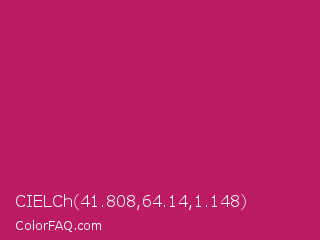 CIELCh 41.808,64.14,1.148 Color is a normal rose color and the nearest color is Rose Red #c21e56. Hex code #bc1b63 and RGB value is rgb(188,27,99). In RGB color space, this color is composed of 74% red, 11% green, 39% blue, In CMYK color space, this color is composed of 0% cyan, 86% magenta, 47% yellow , 26% black , In HSL color space, this color has a hue angle of 333° , 75% saturation and 42% lightness.