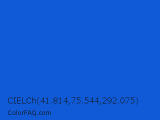 CIELCh 41.814,75.544,292.075 Color is a normal blue color and the nearest color is Science Blue #0066cc. Hex code #105ad8 and RGB value is rgb(16,90,216). In RGB color space, this color is composed of 6% red, 35% green, 85% blue, In CMYK color space, this color is composed of 93% cyan, 58% magenta, 0% yellow , 15% black , In HSL color space, this color has a hue angle of 218° , 86% saturation and 45% lightness.