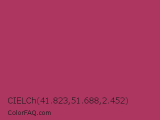 CIELCh 41.823,51.688,2.452 Color is a normal rose color and the nearest color is Rich Maroon #b03060. Hex code #ad3661 and RGB value is rgb(173,54,97). In RGB color space, this color is composed of 68% red, 21% green, 38% blue, In CMYK color space, this color is composed of 0% cyan, 69% magenta, 44% yellow , 32% black , In HSL color space, this color has a hue angle of 338° , 52% saturation and 45% lightness.