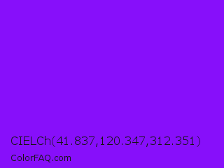 CIELCh 41.837,120.347,312.351 Color is a normal purple color and the nearest color is Electric Violet #8b00ff. Hex code #870ffa and RGB value is rgb(135,15,250). In RGB color space, this color is composed of 53% red, 6% green, 98% blue, In CMYK color space, this color is composed of 46% cyan, 94% magenta, 0% yellow , 2% black , In HSL color space, this color has a hue angle of 271° , 96% saturation and 52% lightness.