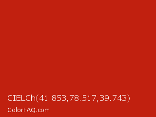 CIELCh 41.853,78.517,39.743 Color is a normal red color and the nearest color is International Orange Engineering #ba160c. Hex code #c1200f and RGB value is rgb(193,32,15). In RGB color space, this color is composed of 76% red, 13% green, 6% blue, In CMYK color space, this color is composed of 0% cyan, 83% magenta, 92% yellow , 24% black , In HSL color space, this color has a hue angle of 6° , 86% saturation and 41% lightness.