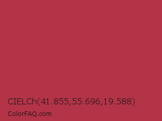 CIELCh 41.855,55.696,19.588 Color is a normal red color and the nearest color is Amaranth Purple #ab274f. Hex code #b33347 and RGB value is rgb(179,51,71). In RGB color space, this color is composed of 70% red, 20% green, 28% blue, In CMYK color space, this color is composed of 0% cyan, 72% magenta, 60% yellow , 30% black , In HSL color space, this color has a hue angle of 351° , 56% saturation and 45% lightness.