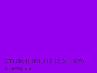 CIELCh 41.861,115.12,314.925 Color is a normal purple color and the nearest color is Electric Violet #8f00ff. Hex code #9400ed and RGB value is rgb(148,0,237). In RGB color space, this color is composed of 58% red, 0% green, 93% blue, In CMYK color space, this color is composed of 38% cyan, 100% magenta, 0% yellow , 7% black , In HSL color space, this color has a hue angle of 277° , 100% saturation and 46% lightness.