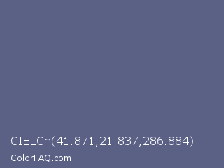 CIELCh 41.871,21.837,286.884 Color is a normal blue color and the nearest color is Paynes Grey #536878. Hex code #5a6185 and RGB value is rgb(90,97,133). In RGB color space, this color is composed of 35% red, 38% green, 52% blue, In CMYK color space, this color is composed of 32% cyan, 27% magenta, 0% yellow , 48% black , In HSL color space, this color has a hue angle of 230° , 19% saturation and 44% lightness.