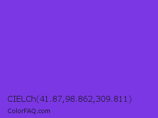 CIELCh 41.87,98.862,309.811 Color is a normal violet color and the nearest color is Blue Violet #8a2be2. Hex code #7a37e3 and RGB value is rgb(122,55,227). In RGB color space, this color is composed of 48% red, 22% green, 89% blue, In CMYK color space, this color is composed of 46% cyan, 76% magenta, 0% yellow , 11% black , In HSL color space, this color has a hue angle of 263° , 75% saturation and 55% lightness.