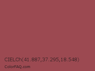 CIELCh 41.887,37.295,18.548 Color is a normal red color and the nearest color is Copper Rust #944747. Hex code #9c4951 and RGB value is rgb(156,73,81). In RGB color space, this color is composed of 61% red, 29% green, 32% blue, In CMYK color space, this color is composed of 0% cyan, 53% magenta, 48% yellow , 39% black , In HSL color space, this color has a hue angle of 354° , 36% saturation and 45% lightness.