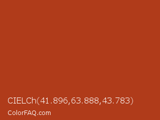 CIELCh 41.896,63.888,43.783 Color is a normal red color and the nearest color is Chinese Red #aa381e. Hex code #b03b1a and RGB value is rgb(176,59,26). In RGB color space, this color is composed of 69% red, 23% green, 10% blue, In CMYK color space, this color is composed of 0% cyan, 66% magenta, 85% yellow , 31% black , In HSL color space, this color has a hue angle of 13° , 74% saturation and 40% lightness.