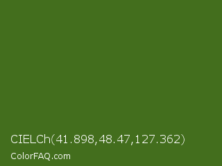 CIELCh 41.898,48.47,127.362 Color is a dark green color and the nearest color is Green Leaf #436a0d. Hex code #436e1d and RGB value is rgb(67,110,29). In RGB color space, this color is composed of 26% red, 43% green, 11% blue, In CMYK color space, this color is composed of 39% cyan, 0% magenta, 74% yellow , 57% black , In HSL color space, this color has a hue angle of 92° , 58% saturation and 27% lightness.