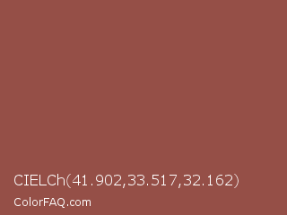 CIELCh 41.902,33.517,32.162 Color is a normal red color and the nearest color is Copper Rust #944747. Hex code #954f47 and RGB value is rgb(149,79,71). In RGB color space, this color is composed of 58% red, 31% green, 28% blue, In CMYK color space, this color is composed of 0% cyan, 47% magenta, 52% yellow , 42% black , In HSL color space, this color has a hue angle of 6° , 35% saturation and 43% lightness.
