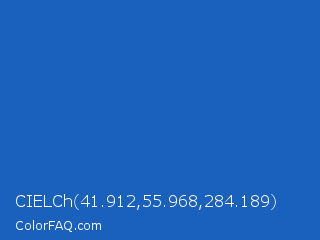 CIELCh 41.912,55.968,284.189 Color is a normal blue color and the nearest color is Denim #1560bd. Hex code #1a61bd and RGB value is rgb(26,97,189). In RGB color space, this color is composed of 10% red, 38% green, 74% blue, In CMYK color space, this color is composed of 86% cyan, 49% magenta, 0% yellow , 26% black , In HSL color space, this color has a hue angle of 214° , 76% saturation and 42% lightness.