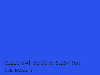 CIELCh 41.93,91.875,297.95 Color is a normal blue color and the nearest color is Palatinate Blue #273be2. Hex code #2b51ec and RGB value is rgb(43,81,236). In RGB color space, this color is composed of 17% red, 32% green, 93% blue, In CMYK color space, this color is composed of 82% cyan, 66% magenta, 0% yellow , 7% black , In HSL color space, this color has a hue angle of 228° , 84% saturation and 55% lightness.