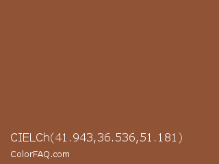 CIELCh 41.943,36.536,51.181 Color is a normal orange color and the nearest color is Potters Clay #8c5738. Hex code #915335 and RGB value is rgb(145,83,53). In RGB color space, this color is composed of 57% red, 33% green, 21% blue, In CMYK color space, this color is composed of 0% cyan, 43% magenta, 63% yellow , 43% black , In HSL color space, this color has a hue angle of 20° , 46% saturation and 39% lightness.