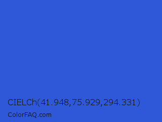 CIELCh 41.948,75.929,294.331 Color is a normal blue color and the nearest color is Mariner #286acd. Hex code #2e58d7 and RGB value is rgb(46,88,215). In RGB color space, this color is composed of 18% red, 35% green, 84% blue, In CMYK color space, this color is composed of 79% cyan, 59% magenta, 0% yellow , 16% black , In HSL color space, this color has a hue angle of 225° , 68% saturation and 51% lightness.
