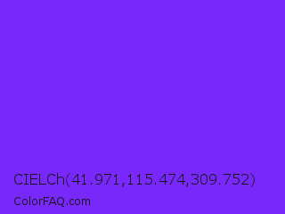 CIELCh 41.971,115.474,309.752 Color is a normal violet color and the nearest color is Blue Violet #8a2be2. Hex code #7829fa and RGB value is rgb(120,41,250). In RGB color space, this color is composed of 47% red, 16% green, 98% blue, In CMYK color space, this color is composed of 52% cyan, 84% magenta, 0% yellow , 2% black , In HSL color space, this color has a hue angle of 263° , 95% saturation and 57% lightness.