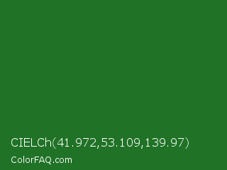 CIELCh 41.972,53.109,139.97 Color is a dark green color and the nearest color is Forest Green #228b22. Hex code #207226 and RGB value is rgb(32,114,38). In RGB color space, this color is composed of 13% red, 45% green, 15% blue, In CMYK color space, this color is composed of 72% cyan, 0% magenta, 67% yellow , 55% black , In HSL color space, this color has a hue angle of 124° , 56% saturation and 29% lightness.