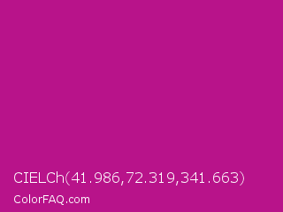 CIELCh 41.986,72.319,341.663 Color is a normal magenta color and the nearest color is Red Violet #c71585. Hex code #b8138a and RGB value is rgb(184,19,138). In RGB color space, this color is composed of 72% red, 7% green, 54% blue, In CMYK color space, this color is composed of 0% cyan, 90% magenta, 25% yellow , 28% black , In HSL color space, this color has a hue angle of 317° , 81% saturation and 40% lightness.