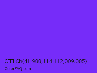 CIELCh 41.988,114.112,309.385 Color is a normal violet color and the nearest color is Blue Violet #8a2be2. Hex code #762cf9 and RGB value is rgb(118,44,249). In RGB color space, this color is composed of 46% red, 17% green, 98% blue, In CMYK color space, this color is composed of 53% cyan, 82% magenta, 0% yellow , 2% black , In HSL color space, this color has a hue angle of 262° , 94% saturation and 57% lightness.