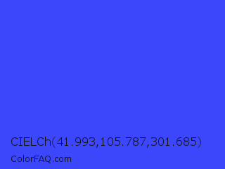 CIELCh 41.993,105.787,301.685 Color is a light blue color and the nearest color is Ultramarine Blue #4166f5. Hex code #3c47fc and RGB value is rgb(60,71,252). In RGB color space, this color is composed of 24% red, 28% green, 99% blue, In CMYK color space, this color is composed of 76% cyan, 72% magenta, 0% yellow , 1% black , In HSL color space, this color has a hue angle of 237° , 97% saturation and 61% lightness.