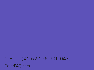CIELCh 41,62.126,301.043 Color is a normal indigo color and the nearest color is Blue Violet #6456b7. Hex code #5d52b9 and RGB value is rgb(93,82,185). In RGB color space, this color is composed of 36% red, 32% green, 73% blue, In CMYK color space, this color is composed of 50% cyan, 56% magenta, 0% yellow , 27% black , In HSL color space, this color has a hue angle of 246° , 42% saturation and 52% lightness.