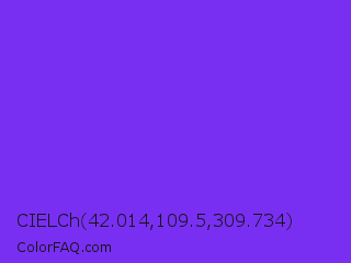 CIELCh 42.014,109.5,309.734 Color is a normal violet color and the nearest color is Blue Violet #8a2be2. Hex code #792ff2 and RGB value is rgb(121,47,242). In RGB color space, this color is composed of 47% red, 18% green, 95% blue, In CMYK color space, this color is composed of 50% cyan, 81% magenta, 0% yellow , 5% black , In HSL color space, this color has a hue angle of 263° , 88% saturation and 57% lightness.