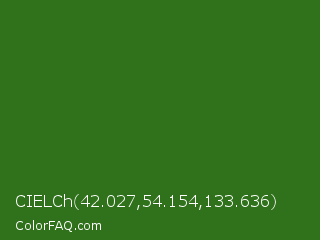 CIELCh 42.027,54.154,133.636 Color is a dark green color and the nearest color is Bilbao #327c14. Hex code #30711b and RGB value is rgb(48,113,27). In RGB color space, this color is composed of 19% red, 44% green, 11% blue, In CMYK color space, this color is composed of 58% cyan, 0% magenta, 76% yellow , 56% black , In HSL color space, this color has a hue angle of 105° , 61% saturation and 27% lightness.