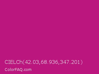 CIELCh 42.03,68.936,347.201 Color is a normal magenta color and the nearest color is Red Violet #c71585. Hex code #ba167e and RGB value is rgb(186,22,126). In RGB color space, this color is composed of 73% red, 9% green, 49% blue, In CMYK color space, this color is composed of 0% cyan, 88% magenta, 32% yellow , 27% black , In HSL color space, this color has a hue angle of 322° , 79% saturation and 41% lightness.