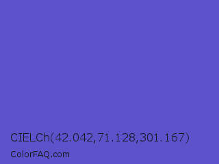 CIELCh 42.042,71.128,301.167 Color is a normal indigo color and the nearest color is Iris #5a4fcf. Hex code #5c52c9 and RGB value is rgb(92,82,201). In RGB color space, this color is composed of 36% red, 32% green, 79% blue, In CMYK color space, this color is composed of 54% cyan, 59% magenta, 0% yellow , 21% black , In HSL color space, this color has a hue angle of 245° , 52% saturation and 55% lightness.