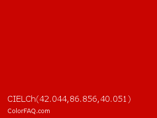 CIELCh 42.044,86.856,40.051 Color is a normal red color and the nearest color is Boston University Red #cc0000. Hex code #c90501 and RGB value is rgb(201,5,1). In RGB color space, this color is composed of 79% red, 2% green, 0% blue, In CMYK color space, this color is composed of 0% cyan, 98% magenta, 100% yellow , 21% black , In HSL color space, this color has a hue angle of 1° , 99% saturation and 40% lightness.