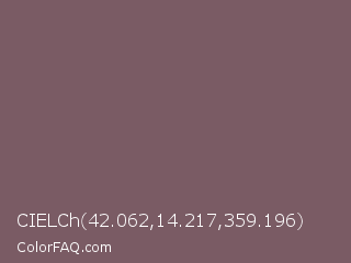 CIELCh 42.062,14.217,359.196 Color is a normal rose color and the nearest color is Deep Taupe #7e5e60. Hex code #7a5b64 and RGB value is rgb(122,91,100). In RGB color space, this color is composed of 48% red, 36% green, 39% blue, In CMYK color space, this color is composed of 0% cyan, 25% magenta, 18% yellow , 52% black , In HSL color space, this color has a hue angle of 343° , 15% saturation and 42% lightness.