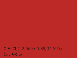 CIELCh 42.069,69.38,34.325 Color is a normal red color and the nearest color is Tall Poppy #b32d29. Hex code #bd2926 and RGB value is rgb(189,41,38). In RGB color space, this color is composed of 74% red, 16% green, 15% blue, In CMYK color space, this color is composed of 0% cyan, 78% magenta, 80% yellow , 26% black , In HSL color space, this color has a hue angle of 1° , 67% saturation and 45% lightness.
