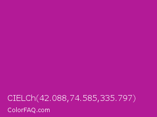 CIELCh 42.088,74.585,335.797 Color is a normal magenta color and the nearest color is Red Violet #c71585. Hex code #b31a97 and RGB value is rgb(179,26,151). In RGB color space, this color is composed of 70% red, 10% green, 59% blue, In CMYK color space, this color is composed of 0% cyan, 85% magenta, 16% yellow , 30% black , In HSL color space, this color has a hue angle of 311° , 75% saturation and 40% lightness.