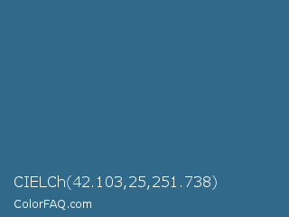 CIELCh 42.103,25,251.738 Color is a normal blue color and the nearest color is Calypso #31728d. Hex code #30698a and RGB value is rgb(48,105,138). In RGB color space, this color is composed of 19% red, 41% green, 54% blue, In CMYK color space, this color is composed of 65% cyan, 24% magenta, 0% yellow , 46% black , In HSL color space, this color has a hue angle of 202° , 48% saturation and 36% lightness.