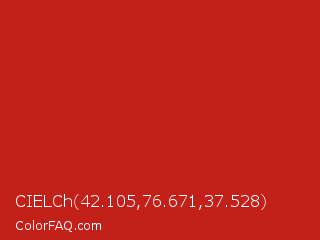 CIELCh 42.105,76.671,37.528 Color is a normal red color and the nearest color is Thunderbird #c02b18. Hex code #c22018 and RGB value is rgb(194,32,24). In RGB color space, this color is composed of 76% red, 13% green, 9% blue, In CMYK color space, this color is composed of 0% cyan, 84% magenta, 88% yellow , 24% black , In HSL color space, this color has a hue angle of 3° , 78% saturation and 43% lightness.