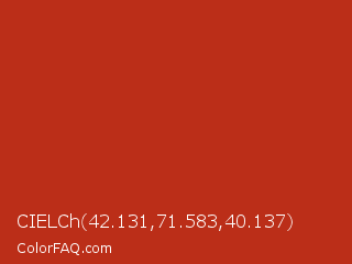 CIELCh 42.131,71.583,40.137 Color is a normal red color and the nearest color is Thunderbird #c02b18. Hex code #bb2e18 and RGB value is rgb(187,46,24). In RGB color space, this color is composed of 73% red, 18% green, 9% blue, In CMYK color space, this color is composed of 0% cyan, 75% magenta, 87% yellow , 27% black , In HSL color space, this color has a hue angle of 8° , 77% saturation and 41% lightness.