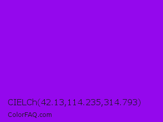 CIELCh 42.13,114.235,314.793 Color is a normal purple color and the nearest color is Electric Violet #8f00ff. Hex code #9408ed and RGB value is rgb(148,8,237). In RGB color space, this color is composed of 58% red, 3% green, 93% blue, In CMYK color space, this color is composed of 38% cyan, 97% magenta, 0% yellow , 7% black , In HSL color space, this color has a hue angle of 277° , 93% saturation and 48% lightness.
