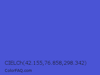CIELCh 42.155,76.858,298.342 Color is a normal blue color and the nearest color is Iris #5a4fcf. Hex code #4a54d5 and RGB value is rgb(74,84,213). In RGB color space, this color is composed of 29% red, 33% green, 84% blue, In CMYK color space, this color is composed of 65% cyan, 61% magenta, 0% yellow , 16% black , In HSL color space, this color has a hue angle of 236° , 62% saturation and 56% lightness.