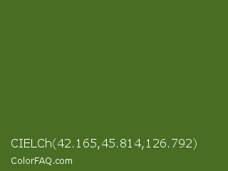 CIELCh 42.165,45.814,126.792 Color is a dark green color and the nearest color is Dark Moss Green #4a5d23. Hex code #476e22 and RGB value is rgb(71,110,34). In RGB color space, this color is composed of 28% red, 43% green, 13% blue, In CMYK color space, this color is composed of 35% cyan, 0% magenta, 69% yellow , 57% black , In HSL color space, this color has a hue angle of 91° , 53% saturation and 28% lightness.