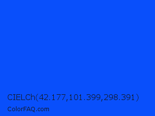CIELCh 42.177,101.399,298.391 Color is a normal blue color and the nearest color is Blue RYB #0247fe. Hex code #094ffb and RGB value is rgb(9,79,251). In RGB color space, this color is composed of 4% red, 31% green, 98% blue, In CMYK color space, this color is composed of 96% cyan, 69% magenta, 0% yellow , 2% black , In HSL color space, this color has a hue angle of 223° , 97% saturation and 51% lightness.