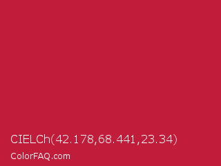 CIELCh 42.178,68.441,23.34 Color is a normal red color and the nearest color is Cardinal #c41e3a. Hex code #c21c3b and RGB value is rgb(194,28,59). In RGB color space, this color is composed of 76% red, 11% green, 23% blue, In CMYK color space, this color is composed of 0% cyan, 86% magenta, 70% yellow , 24% black , In HSL color space, this color has a hue angle of 349° , 75% saturation and 44% lightness.