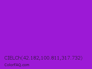 CIELCh 42.182,100.811,317.732 Color is a normal purple color and the nearest color is Dark Violet #9400d3. Hex code #9c19d6 and RGB value is rgb(156,25,214). In RGB color space, this color is composed of 61% red, 10% green, 84% blue, In CMYK color space, this color is composed of 27% cyan, 88% magenta, 0% yellow , 16% black , In HSL color space, this color has a hue angle of 282° , 79% saturation and 47% lightness.
