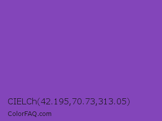 CIELCh 42.195,70.73,313.05 Color is a normal purple color and the nearest color is Studio #714ab2. Hex code #8345ba and RGB value is rgb(131,69,186). In RGB color space, this color is composed of 51% red, 27% green, 73% blue, In CMYK color space, this color is composed of 30% cyan, 63% magenta, 0% yellow , 27% black , In HSL color space, this color has a hue angle of 272° , 46% saturation and 50% lightness.