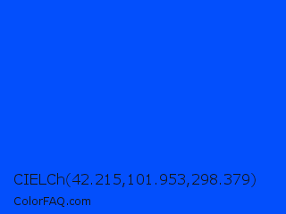 CIELCh 42.215,101.953,298.379 Color is a normal blue color and the nearest color is Blue RYB #0247fe. Hex code #034ffc and RGB value is rgb(3,79,252). In RGB color space, this color is composed of 1% red, 31% green, 99% blue, In CMYK color space, this color is composed of 99% cyan, 69% magenta, 0% yellow , 1% black , In HSL color space, this color has a hue angle of 222° , 98% saturation and 50% lightness.