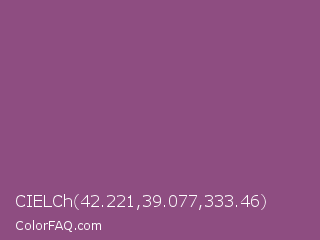CIELCh 42.221,39.077,333.46 Color is a normal magenta color and the nearest color is Razzmic Berry #8d4e85. Hex code #8e4d81 and RGB value is rgb(142,77,129). In RGB color space, this color is composed of 56% red, 30% green, 51% blue, In CMYK color space, this color is composed of 0% cyan, 46% magenta, 9% yellow , 44% black , In HSL color space, this color has a hue angle of 312° , 30% saturation and 43% lightness.