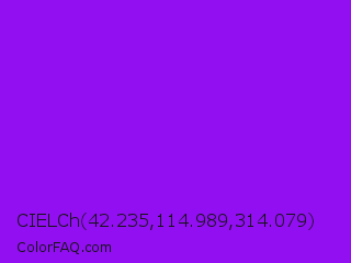 CIELCh 42.235,114.989,314.079 Color is a normal purple color and the nearest color is Electric Violet #8f00ff. Hex code #910ff0 and RGB value is rgb(145,15,240). In RGB color space, this color is composed of 57% red, 6% green, 94% blue, In CMYK color space, this color is composed of 40% cyan, 94% magenta, 0% yellow , 6% black , In HSL color space, this color has a hue angle of 275° , 88% saturation and 50% lightness.