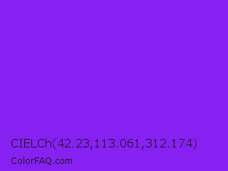 CIELCh 42.23,113.061,312.174 Color is a normal violet color and the nearest color is Blue Violet #8a2be2. Hex code #8721f2 and RGB value is rgb(135,33,242). In RGB color space, this color is composed of 53% red, 13% green, 95% blue, In CMYK color space, this color is composed of 44% cyan, 86% magenta, 0% yellow , 5% black , In HSL color space, this color has a hue angle of 269° , 89% saturation and 54% lightness.