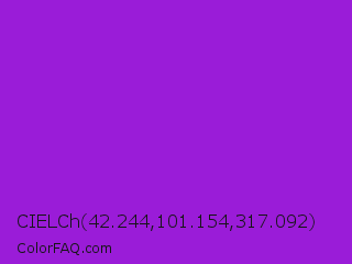 CIELCh 42.244,101.154,317.092 Color is a normal purple color and the nearest color is Blue Violet #8a2be2. Hex code #9a1cd8 and RGB value is rgb(154,28,216). In RGB color space, this color is composed of 60% red, 11% green, 85% blue, In CMYK color space, this color is composed of 29% cyan, 87% magenta, 0% yellow , 15% black , In HSL color space, this color has a hue angle of 280° , 77% saturation and 48% lightness.