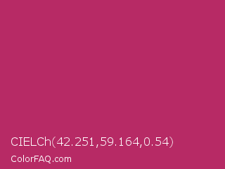 CIELCh 42.251,59.164,0.54 Color is a normal rose color and the nearest color is Hibiscus #b6316c. Hex code #b72a65 and RGB value is rgb(183,42,101). In RGB color space, this color is composed of 72% red, 16% green, 40% blue, In CMYK color space, this color is composed of 0% cyan, 77% magenta, 45% yellow , 28% black , In HSL color space, this color has a hue angle of 335° , 63% saturation and 44% lightness.