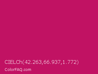 CIELCh 42.263,66.937,1.772 Color is a normal rose color and the nearest color is Rose Red #c21e56. Hex code #c11263 and RGB value is rgb(193,18,99). In RGB color space, this color is composed of 76% red, 7% green, 39% blue, In CMYK color space, this color is composed of 0% cyan, 91% magenta, 49% yellow , 24% black , In HSL color space, this color has a hue angle of 332° , 83% saturation and 41% lightness.