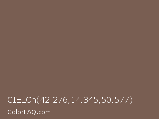 CIELCh 42.276,14.345,50.577 Color is a normal orange color and the nearest color is Roman Coffee #795d4c. Hex code #795e52 and RGB value is rgb(121,94,82). In RGB color space, this color is composed of 47% red, 37% green, 32% blue, In CMYK color space, this color is composed of 0% cyan, 22% magenta, 32% yellow , 53% black , In HSL color space, this color has a hue angle of 18° , 19% saturation and 40% lightness.
